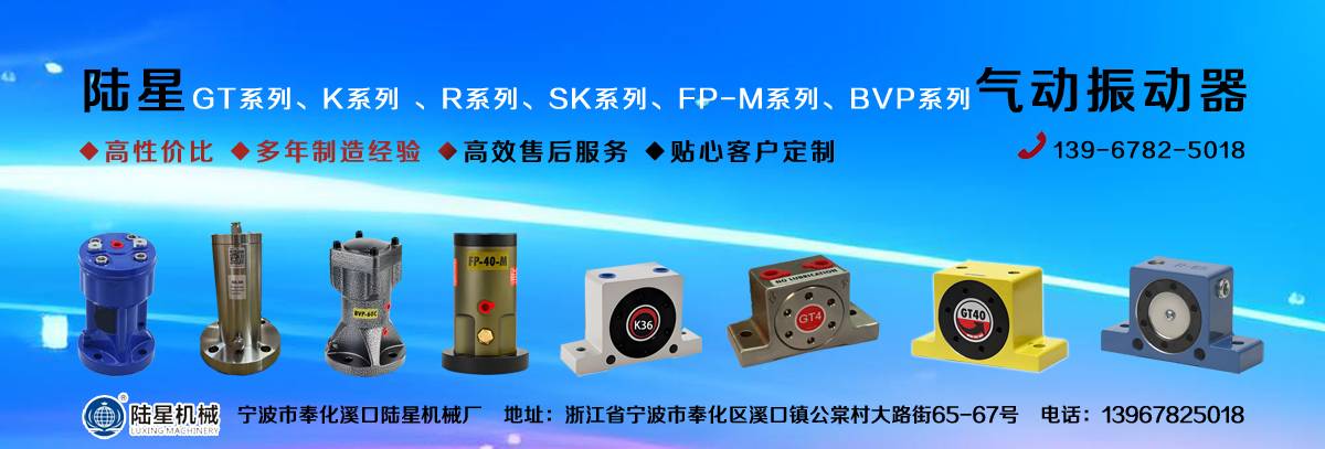 宁波市陆星机械是一家集开发、设计、制造、销售为一体的专业生产气动振动器企业,公司主要生产有:GT系列涡轮式气动振动器、K系列钢珠式气动振动器 、R系列滚轴式气动振动器、SK系列气动敲击锤 、FP-M系列活塞式气动振动器、BVP系列活塞式气动振动器、还有Q22HD系列的流体气控管阀等。公司自成立以来,以“诚信”为宗旨,在同行业中享有较高的信誉,业务开展遍布全国各大城市。 公司本着“以质量求生存,以信誉求客户”的经营态度,一直深受客户的信赖。在公司投入生产时就聘用一批经验丰富的专业技术人员,同时引进国内外先进的生产设备。在不断的探索、发展中,公司技术设备先进,检测手段完善,产品款式多样,质
